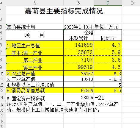 2023年嘉荫县主要指标完成情况(1-10月份)