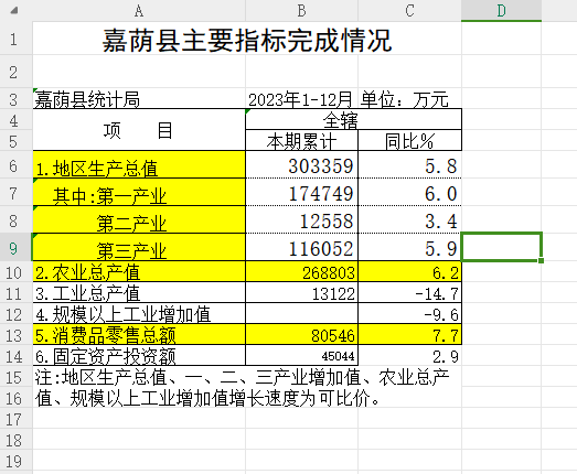 2023年嘉荫县主要指标完成情况(1-12月份)