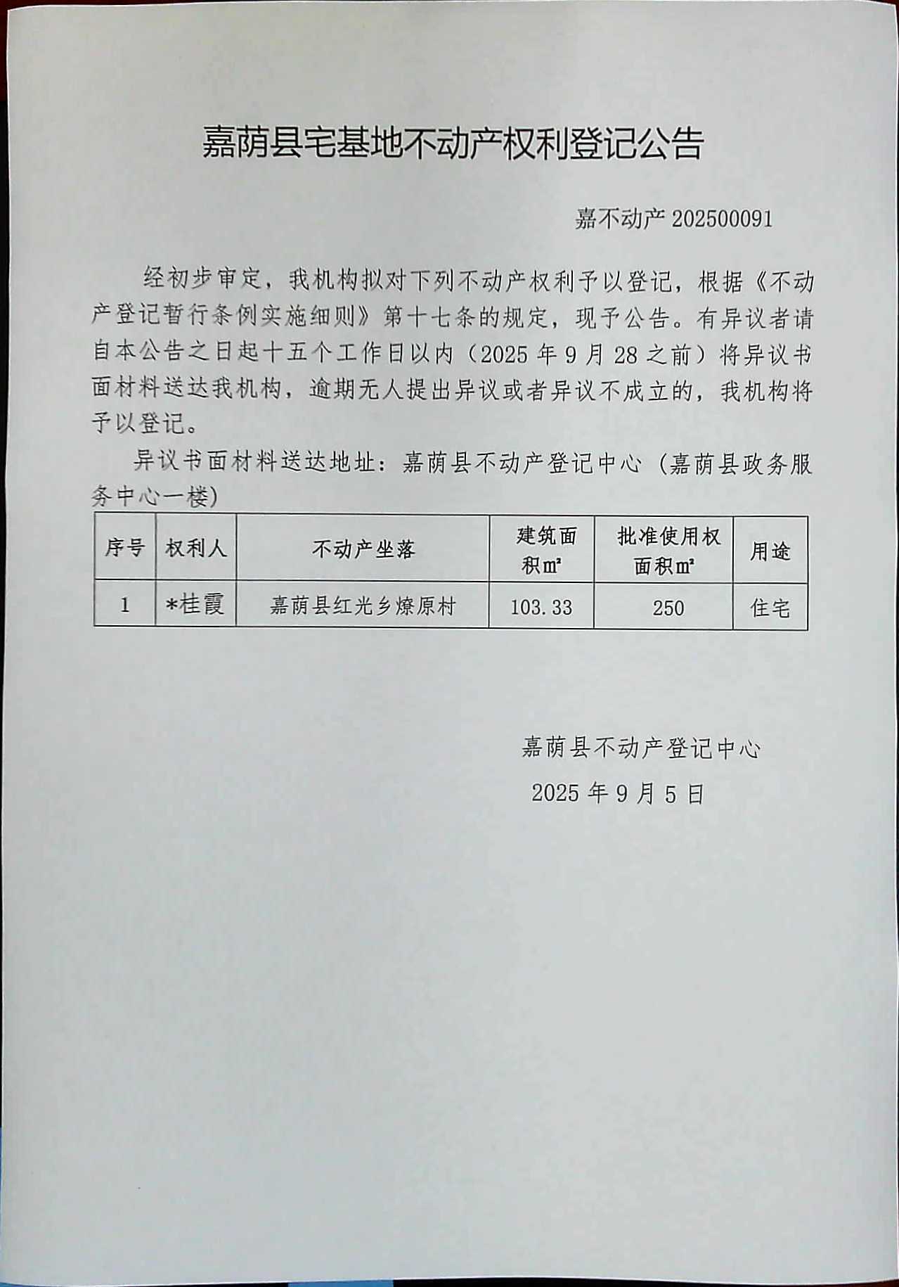 嘉荫县宅基地不动产权利登记公告 嘉不动产202500091