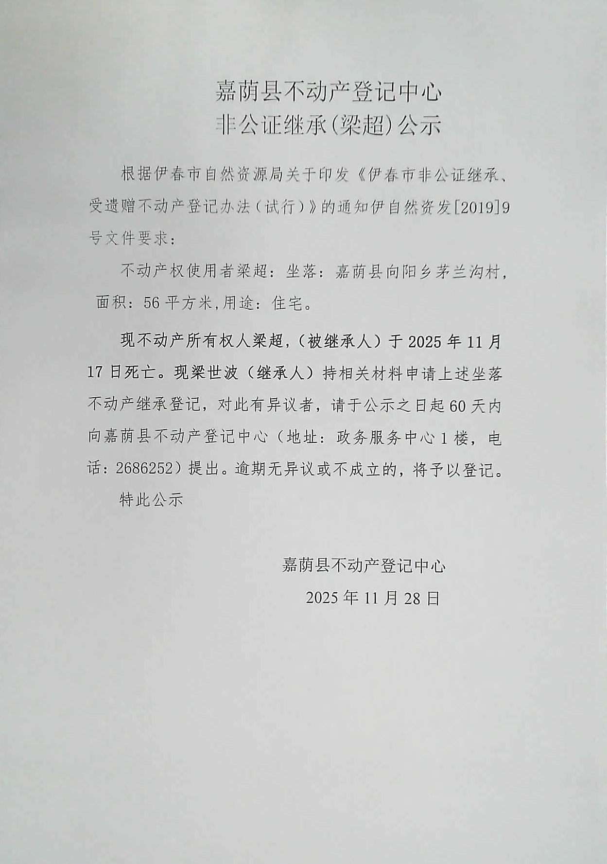 嘉荫县不动产登记中心非公证继承(梁超)公示