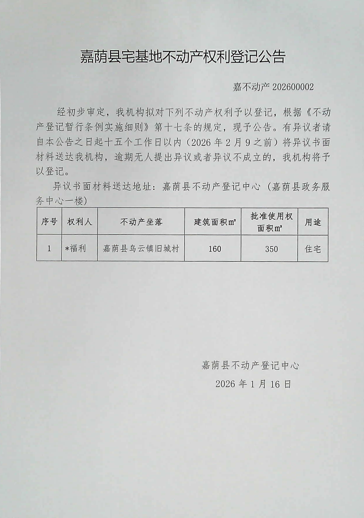 嘉荫县宅基地不动产权利登记公告 嘉不动产202600002
