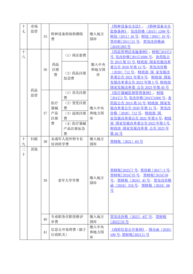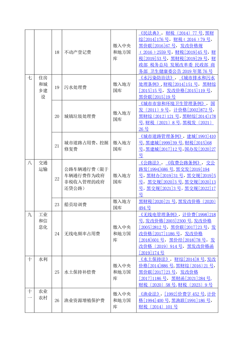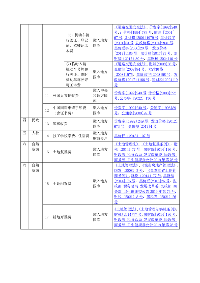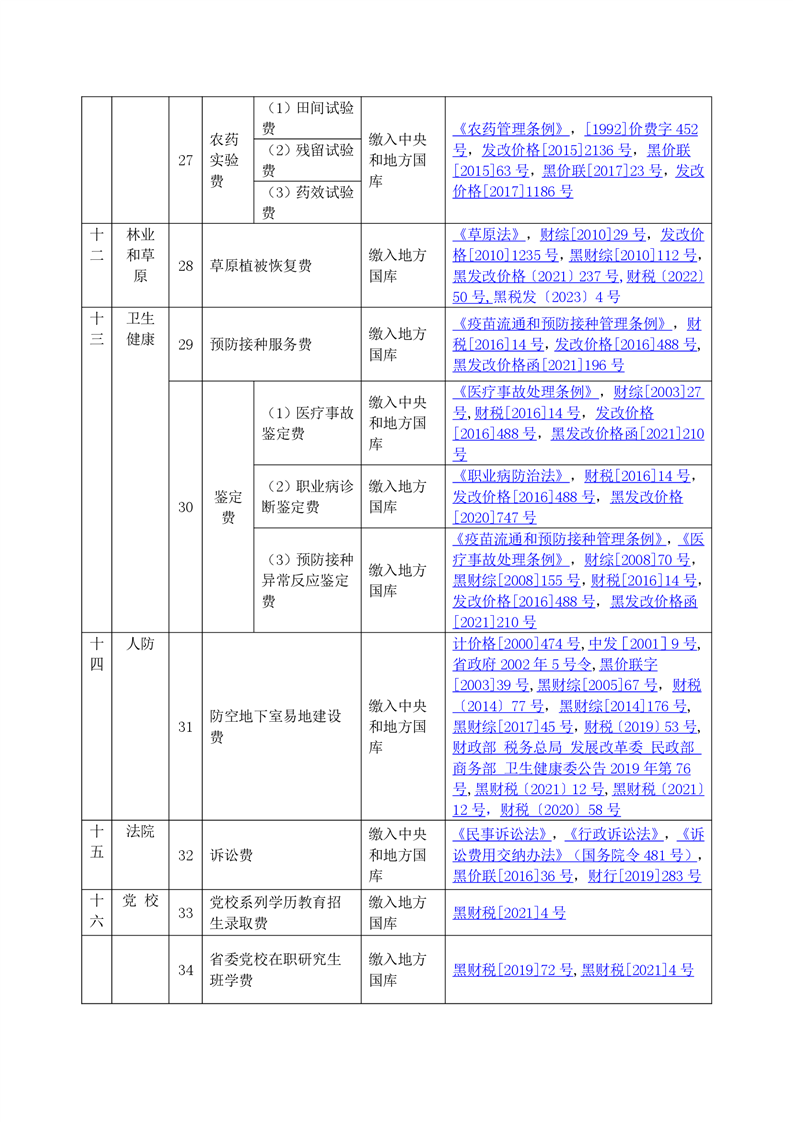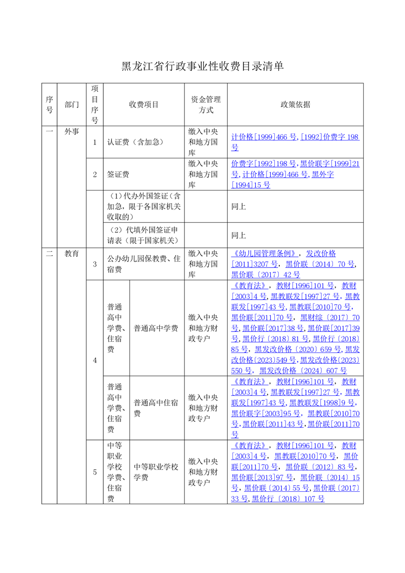 黑龙江省行政事业性收费目录清单