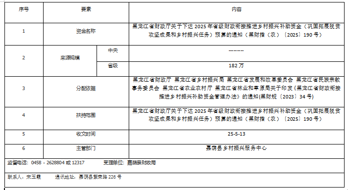 黑龙江省财政厅关于下达2025年省级财政衔接推进乡村振兴补助资金(巩固拓展脱贫攻坚成果和乡村振兴任务)预算的通知 黑财指(农)〔2025〕190号