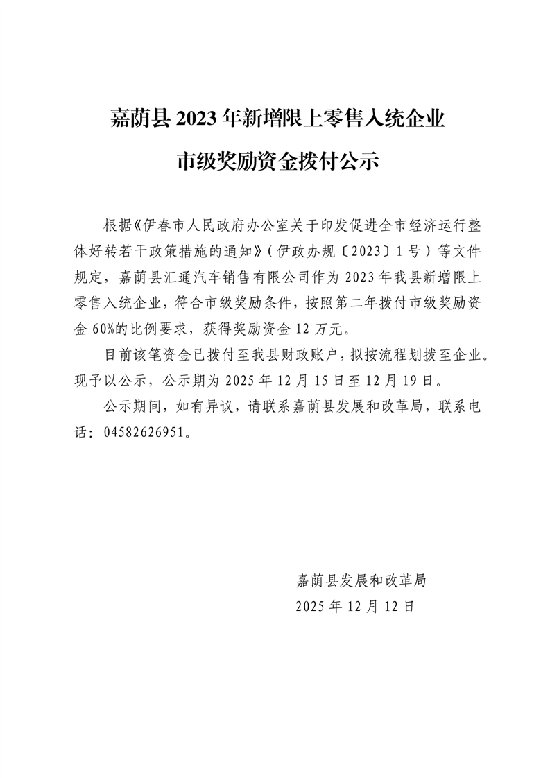 嘉荫县2023年新增限上零售入统企业市级奖励资金拨付公示