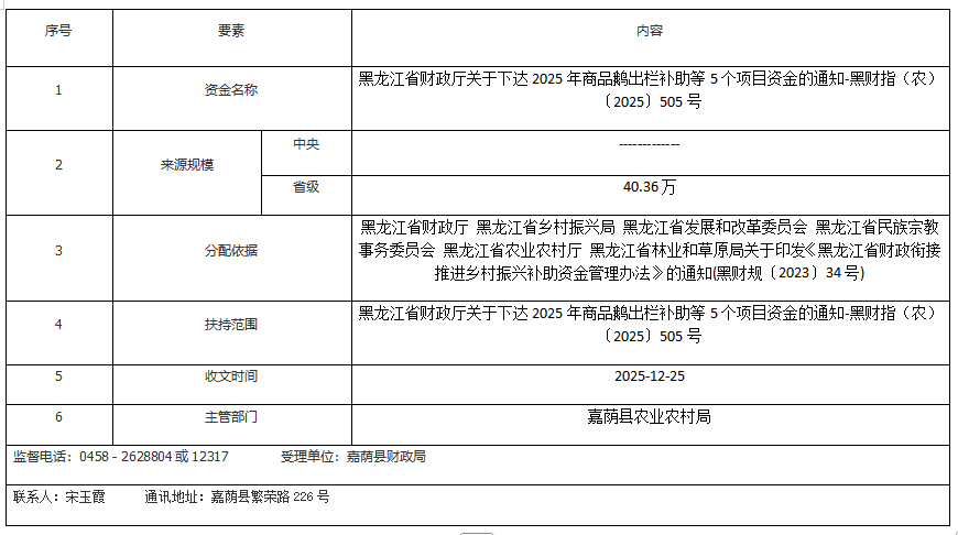 黑龙江省财政厅关于下达2025年商品鹅出栏补助等5个项目资金的通知-黑财指(农)〔2025〕505号